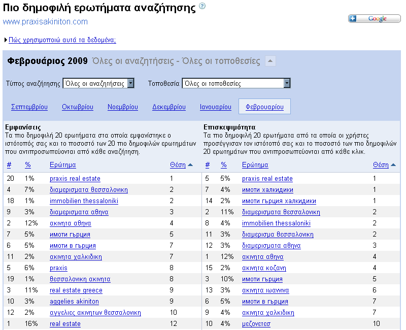 Η κατάταξη της praxisakiniton.com στα πιο δημοφιλή ερωτήματα αναζήτησης ακινήτων μέσα από το google, tyxo.bg και λέξεις κλειδιά μέσα από τα οποία οι επισκέπτες βρήκαν την ιστοσελίδα.